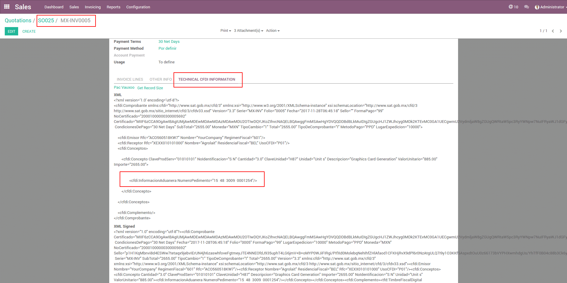 Check the electronic invoice associated with the product where the node of the customs information is displayed