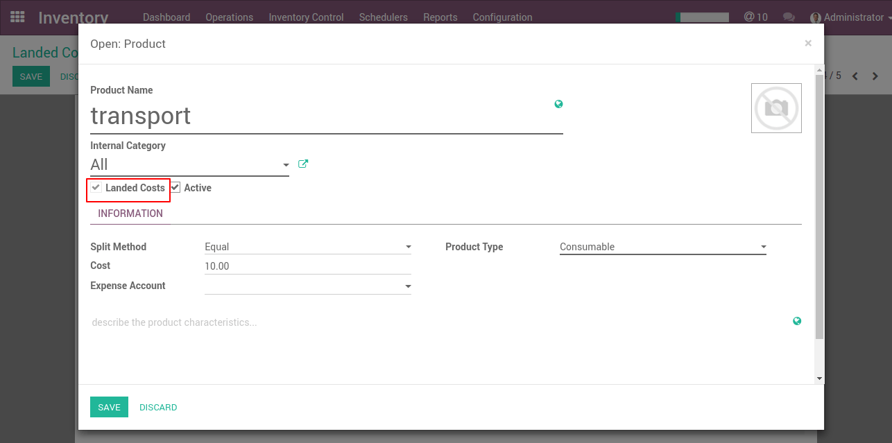Start by creating specific products to indicate your various Landed Costs, such as freight, insurance or custom duties. Go to Inventory -> Configuration -> Landed Cost types. Landed costs are only possible for products configured in real time valuation with real price costing method. The costing method is configured on the product category.