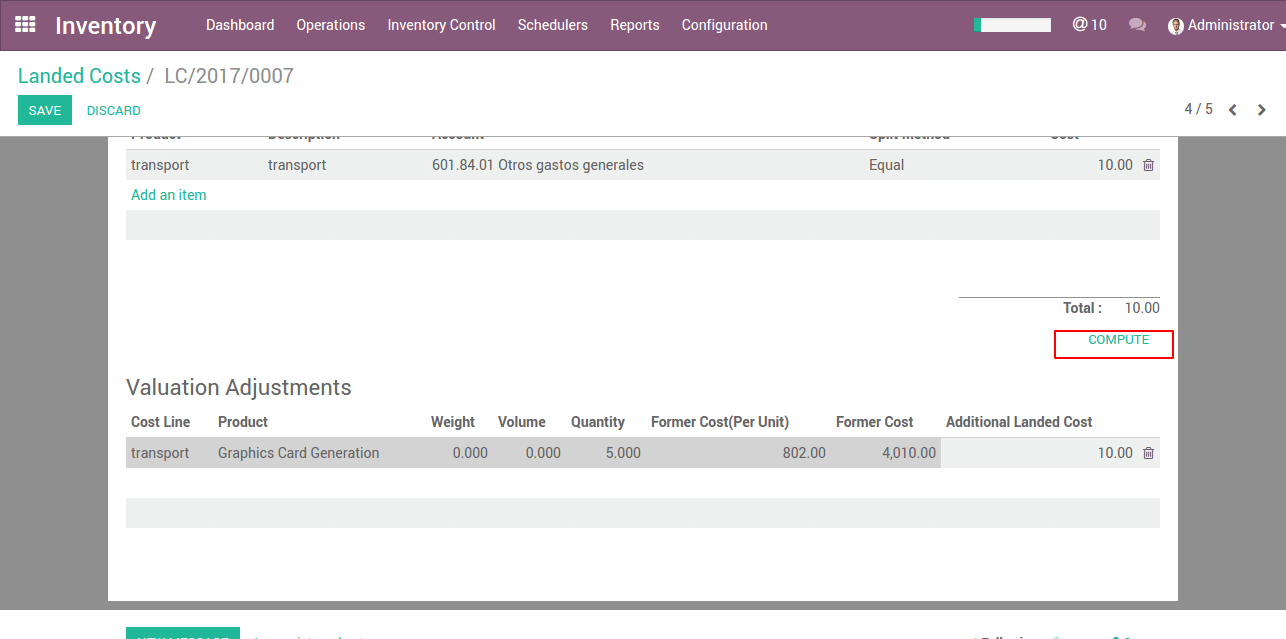 Click the Compute button to see how the landed costs will be split across the picking lines. To confirm the landed costs attribution, click on the Validate button.