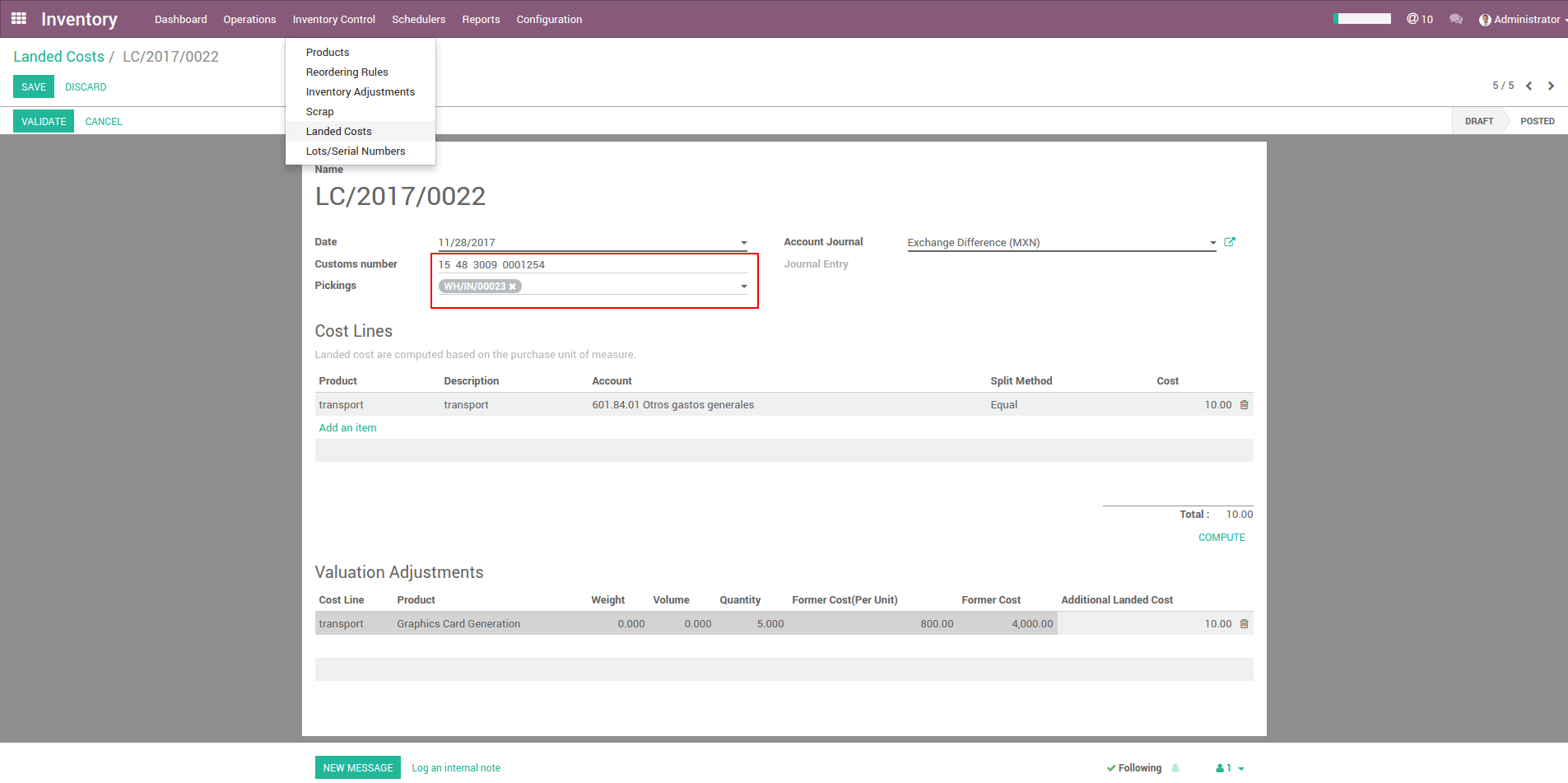 Go to Inventory -> Inventory control -> Landed Cost. Create a new landed cost indicating the picking of the purchase order and the number of the customs information (pedimento). Then calculate and validate the cost of landing
